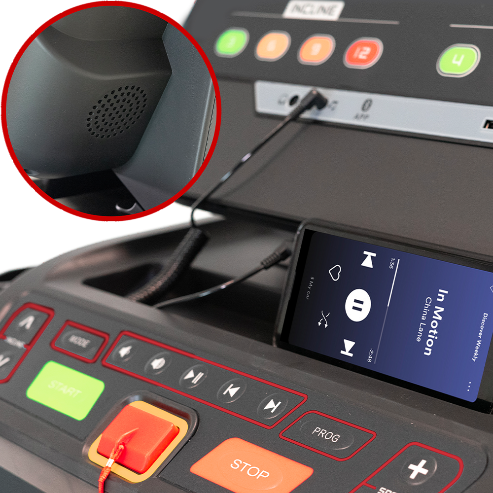Conecta tu MP3, teléfono o tablet a través del cable o Bluetooth para escuchar música durante el entrenamiento a través de sus altavoces incorporados.